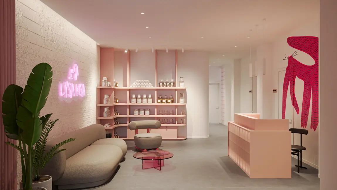 Interiér je založen na pudrově růžové a neutrální barevné paletě, doplněné teplým osvětlením a elegantním nábytkem se zaoblenými tvary. Dominantním bodem prostoru je recepční zóna s neonovým logem a uměleckou stěnou, která podporuje zapamatovatelnost značky.