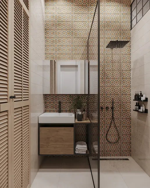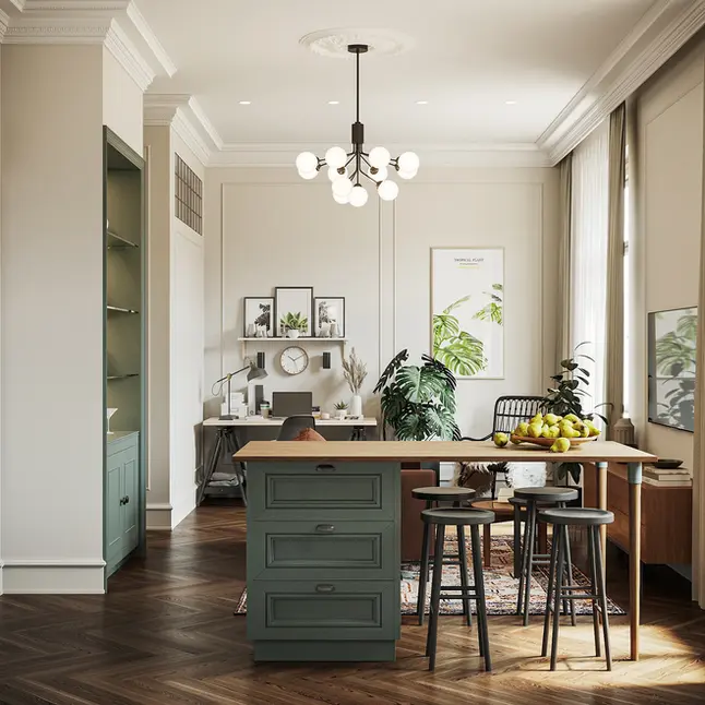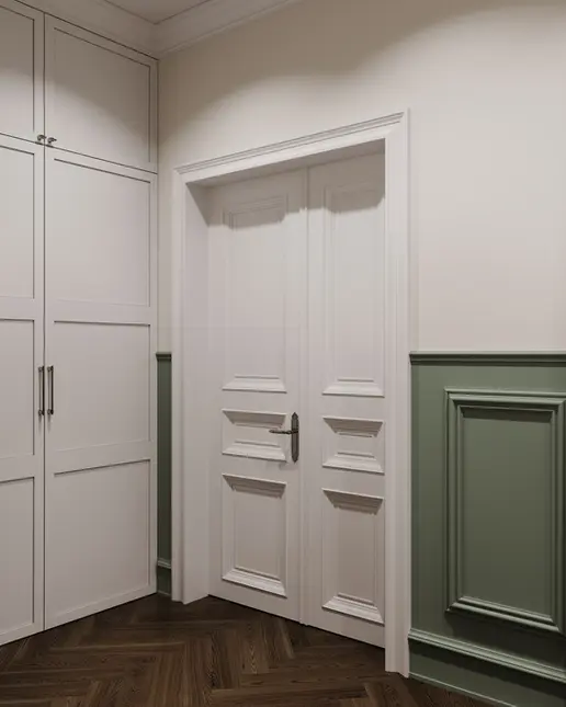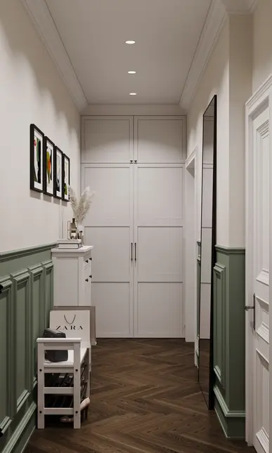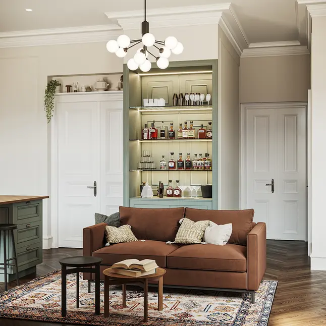 Tento projekt kombinuje současný design s jemnými vintage prvky. Klasické skříňové sestavy, dekorativní obklady a teplé zemitě laděné tóny jsou vyváženy čistými liniemi, moderní funkčností a nábytkem vyrobeným na míru.